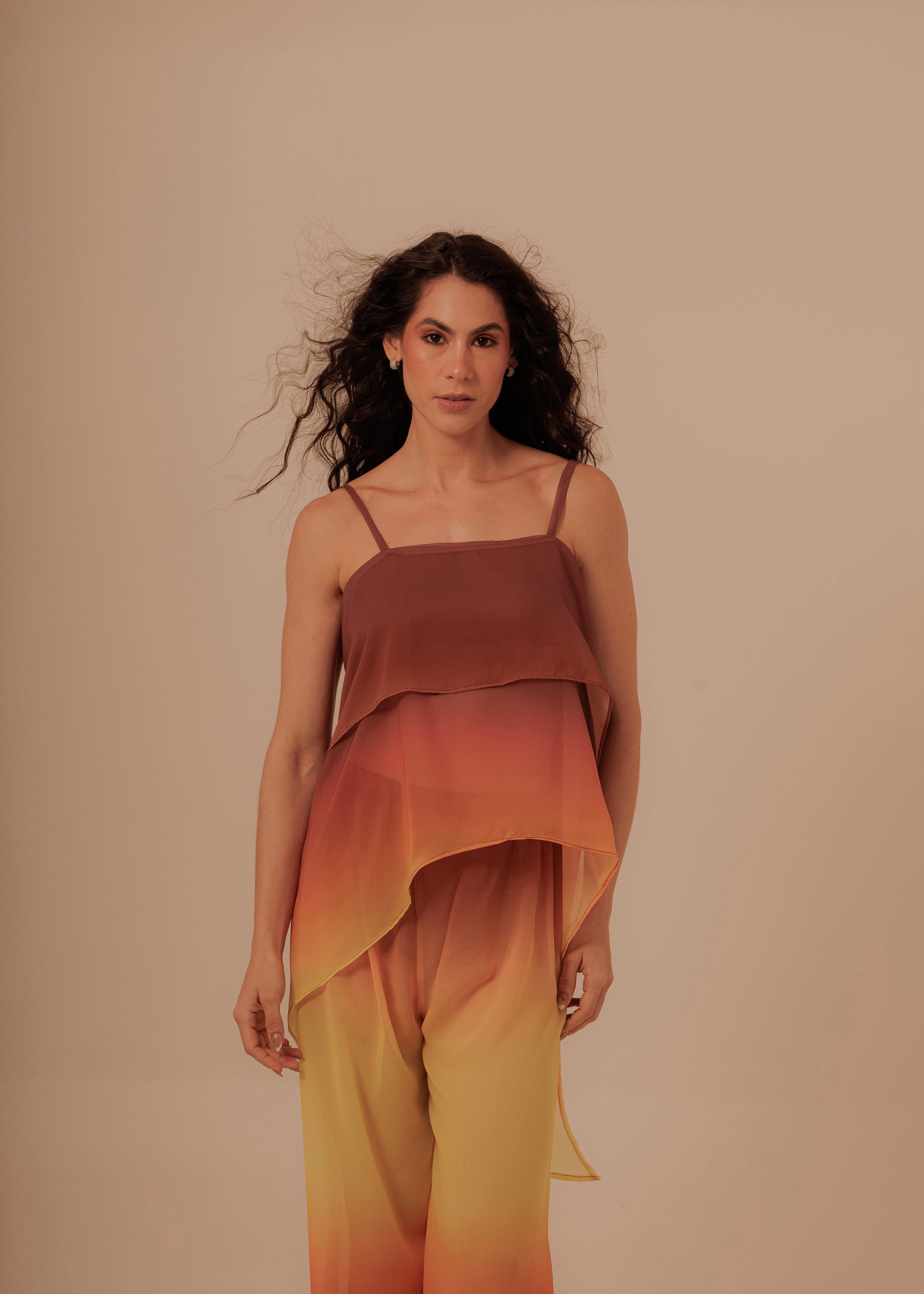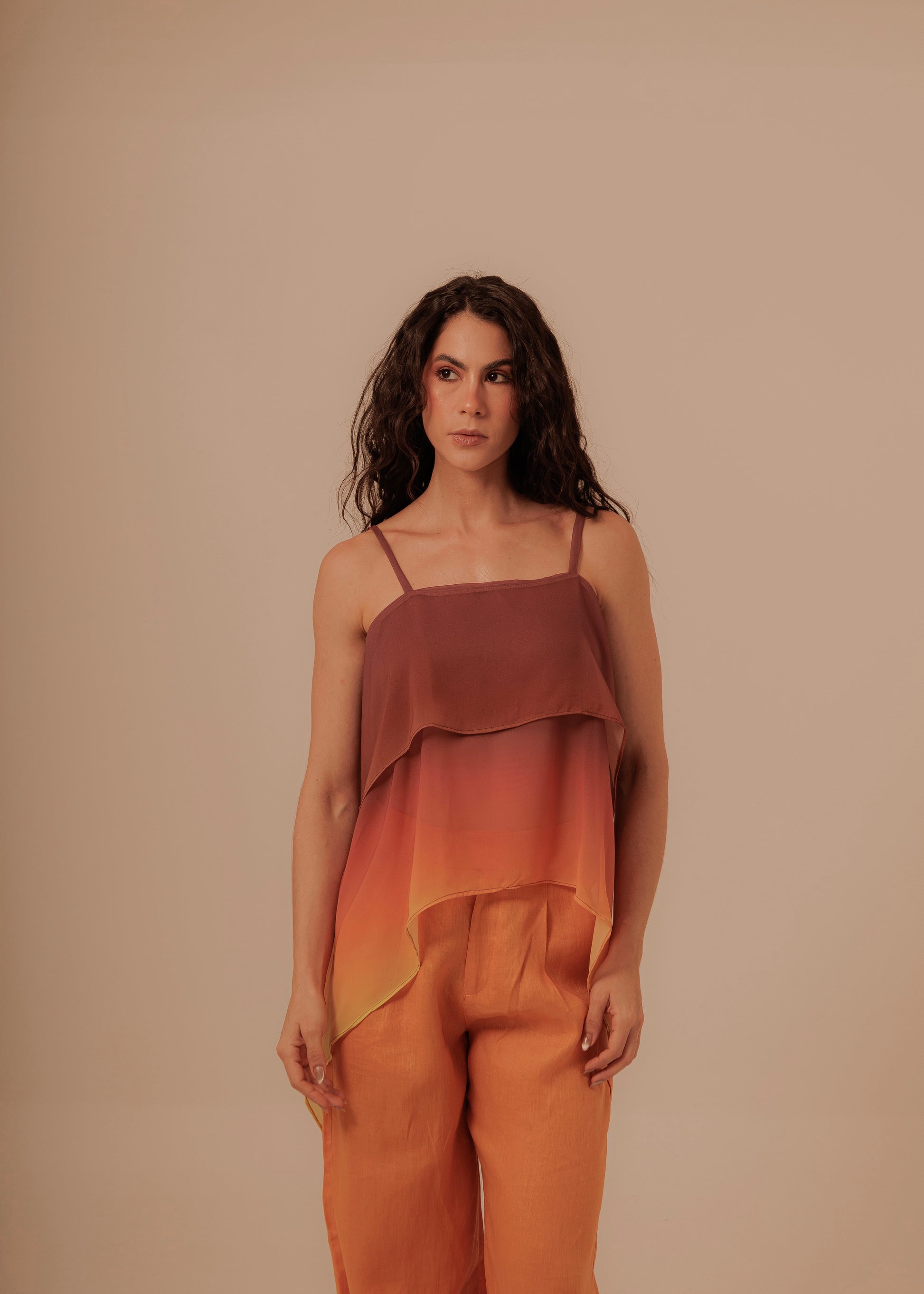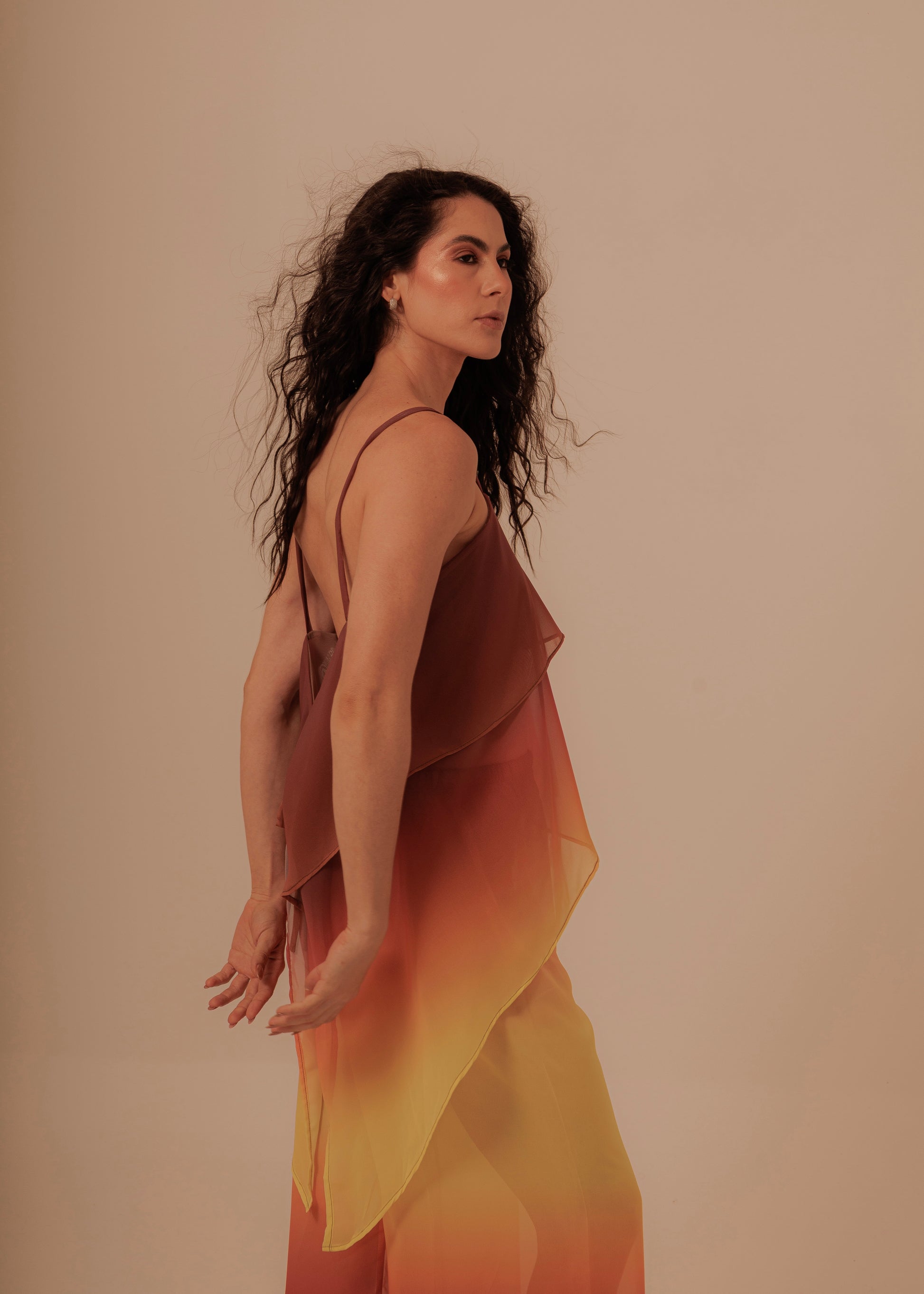 El diseño en capas y el degradado de color, que transita desde tonos profundos hasta matices cálidos tangerine, evocan la intensidad y la calma de un atardecer infinito.