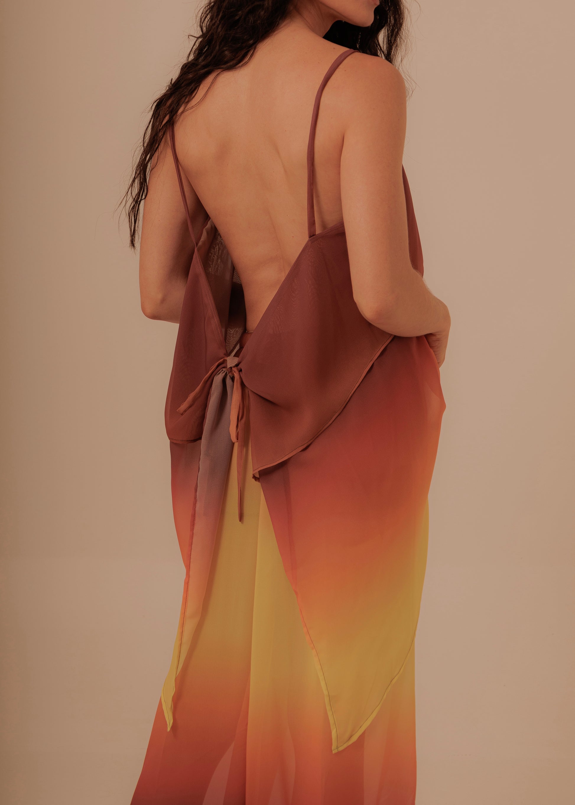 Top fluido en fibra translúcida que aporta ligereza y movimiento a la silueta. Su diseño de tirantes delicados y escote recto al frente contrasta con una espalda descubierta que se ajusta suavemente mediante un lazo, creando un equilibrio perfecto entre sensualidad y sofisticación.