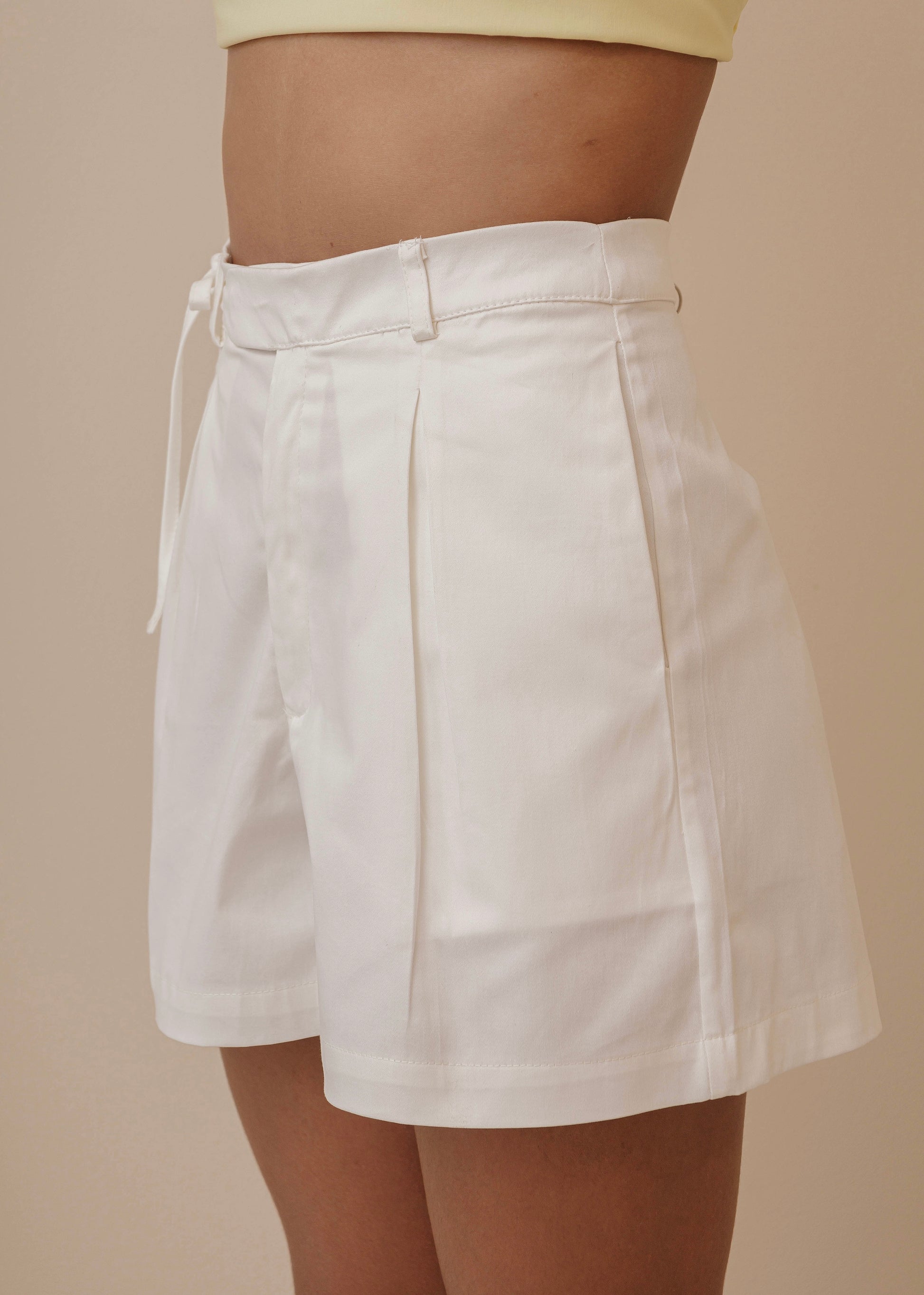 Hechos de algodón ligero, ofrecen un ajuste cómodo y transpirable, perfecto para días cálidos. Con una cintura alta y un delicado lazo ajustable, además de un frente plisado y una silueta entallada, estos shorts combinan sin esfuerzo y aportan sofisticación y comodidad.