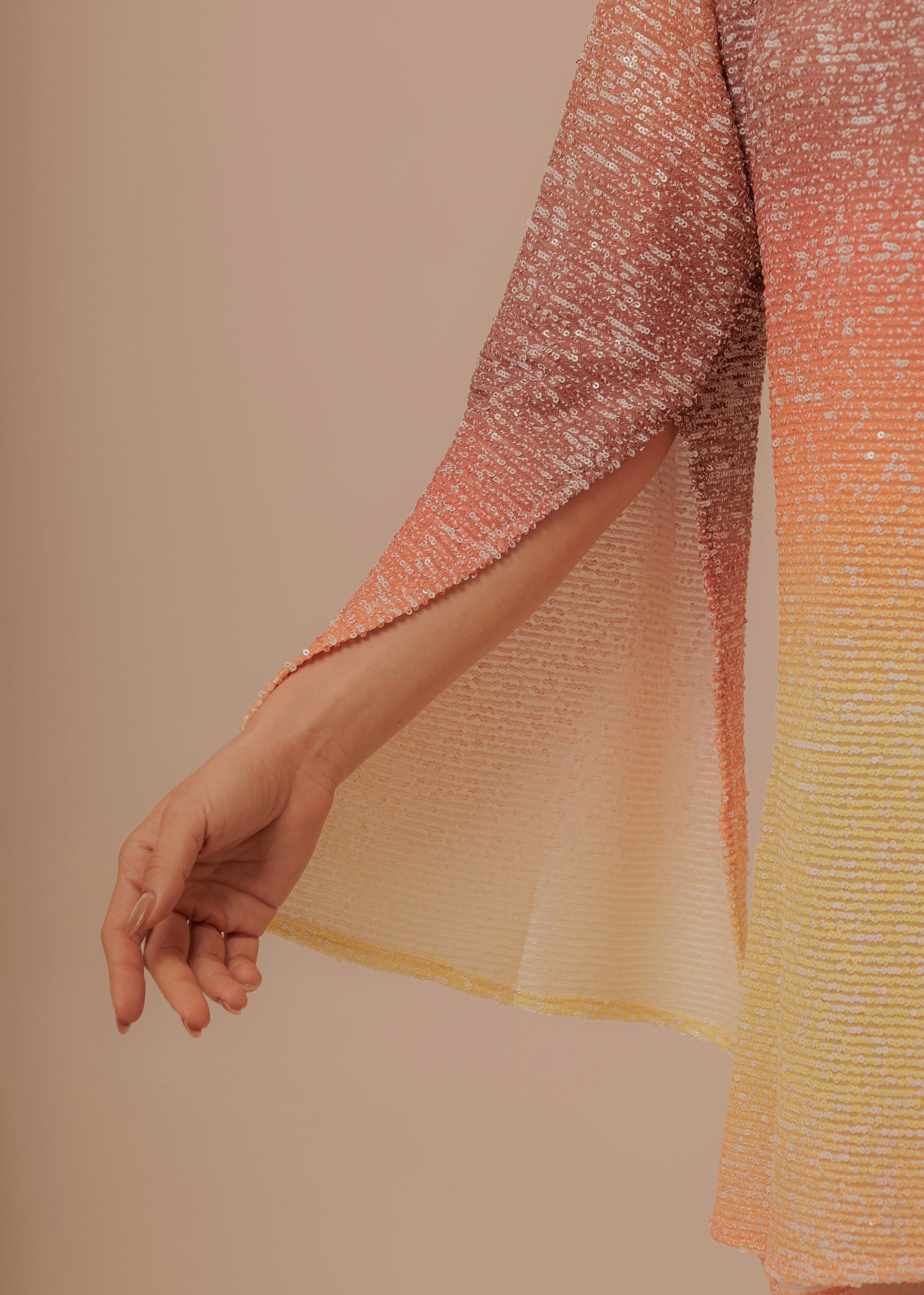 Vestido corto de silueta amplia con mangas acampanadas que aportan movimiento y ligereza. Su diseño equilibra una estética romántica con un aire audaz, creando una pieza protagonista y versátil. El print, inspirado en los atardeceres frente al mar, captura la magia del sol reflejándose en tonos cálidos y vibrantes, evocando momentos dorados junto al Caribe.