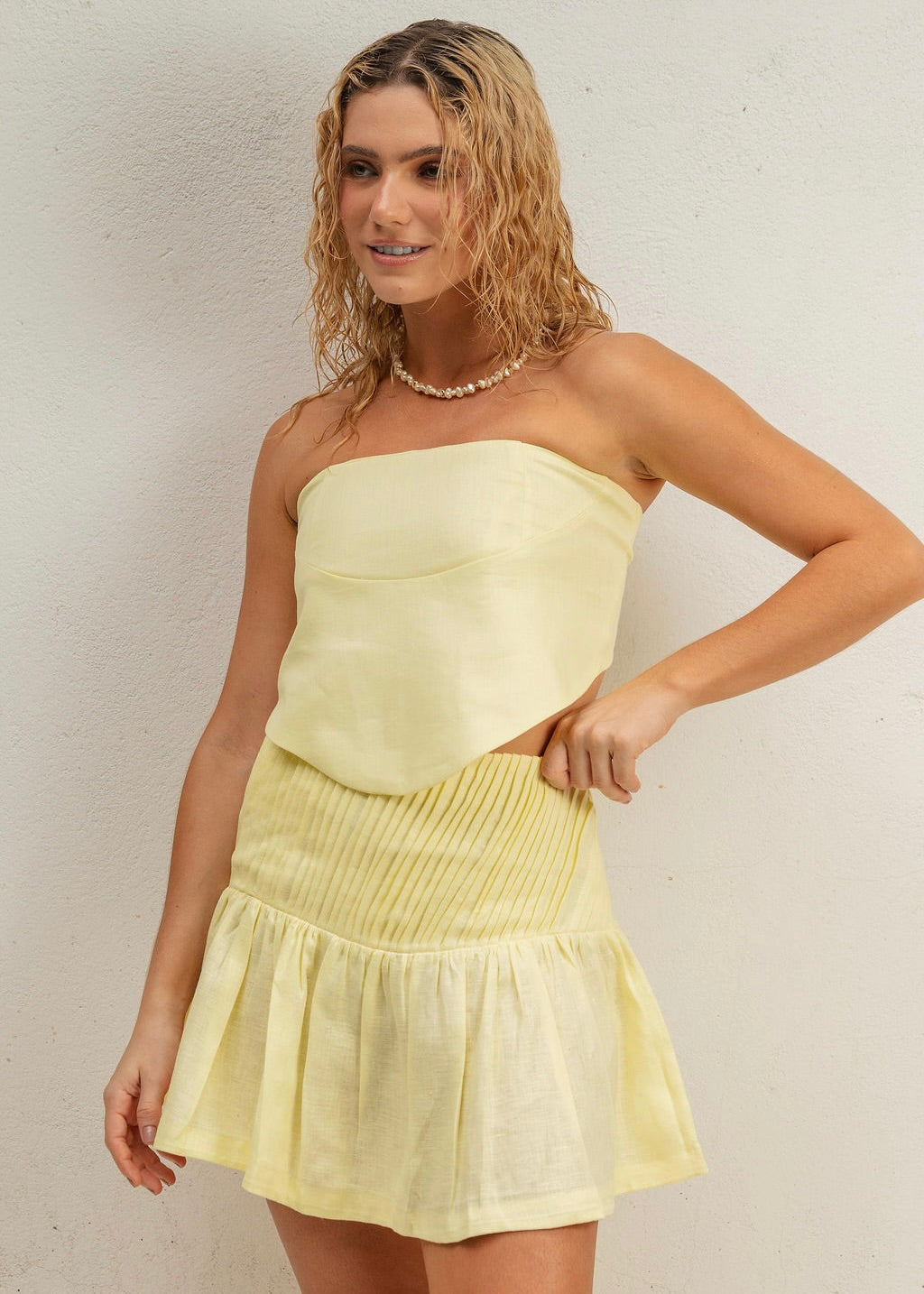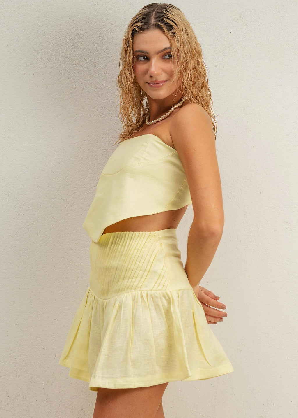El Fold Skirt Set en color Happy Yellow es una expresión de alegría, movimiento y elegancia natural. Confeccionado en lino 100%, este conjunto presenta una blusa de líneas limpias y una falda con pliegues suaves que aportan dinamismo y fluidez a cada paso.