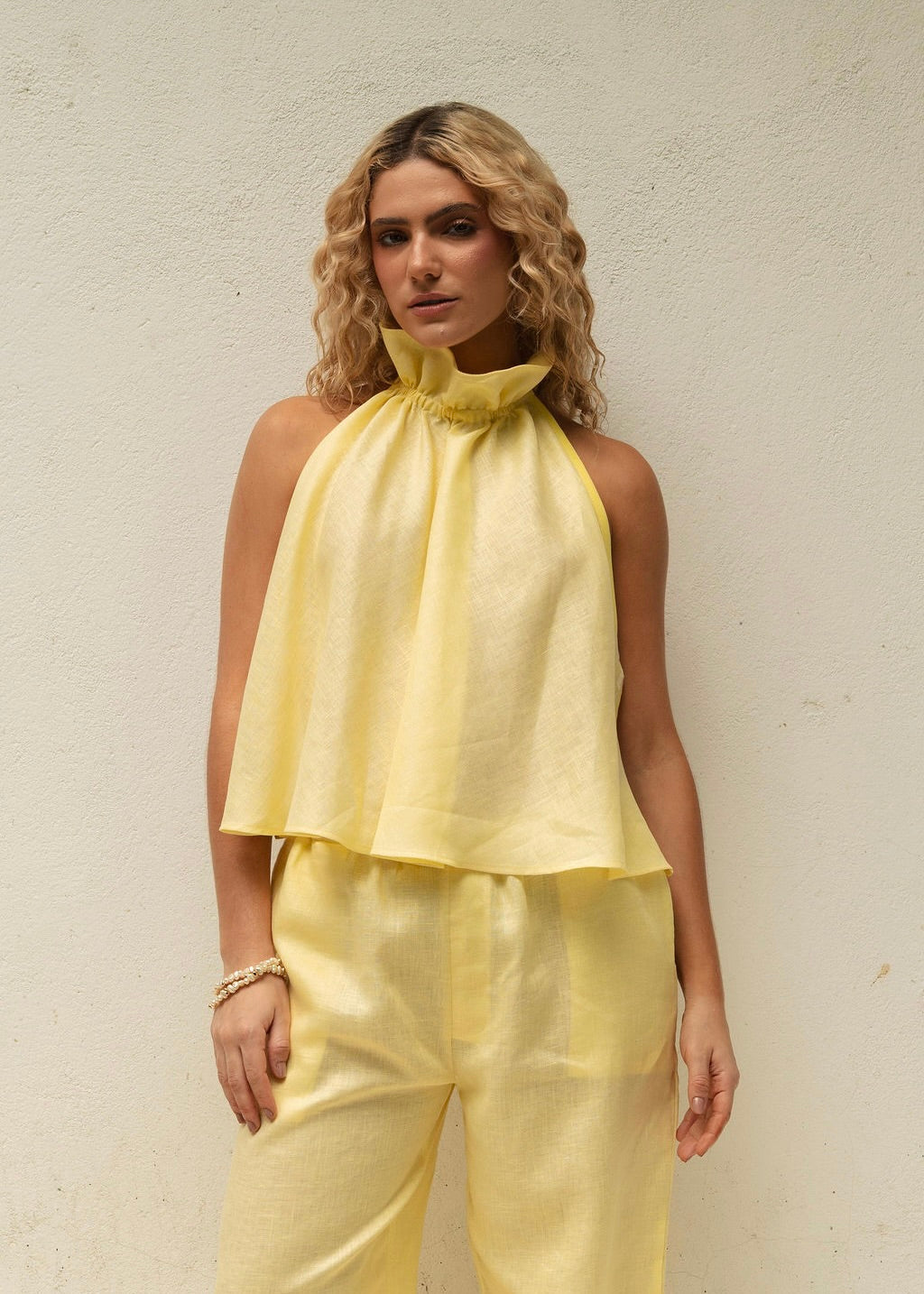 El Halter Backless Top en color Happy Yellow está confeccionado en lino 100% natural, ofreciendo frescura y comodidad en un diseño atrevido con espalda descubierta. Perfecto para quienes quieren destacar con un look veraniego, lleno de vida y sofisticación.