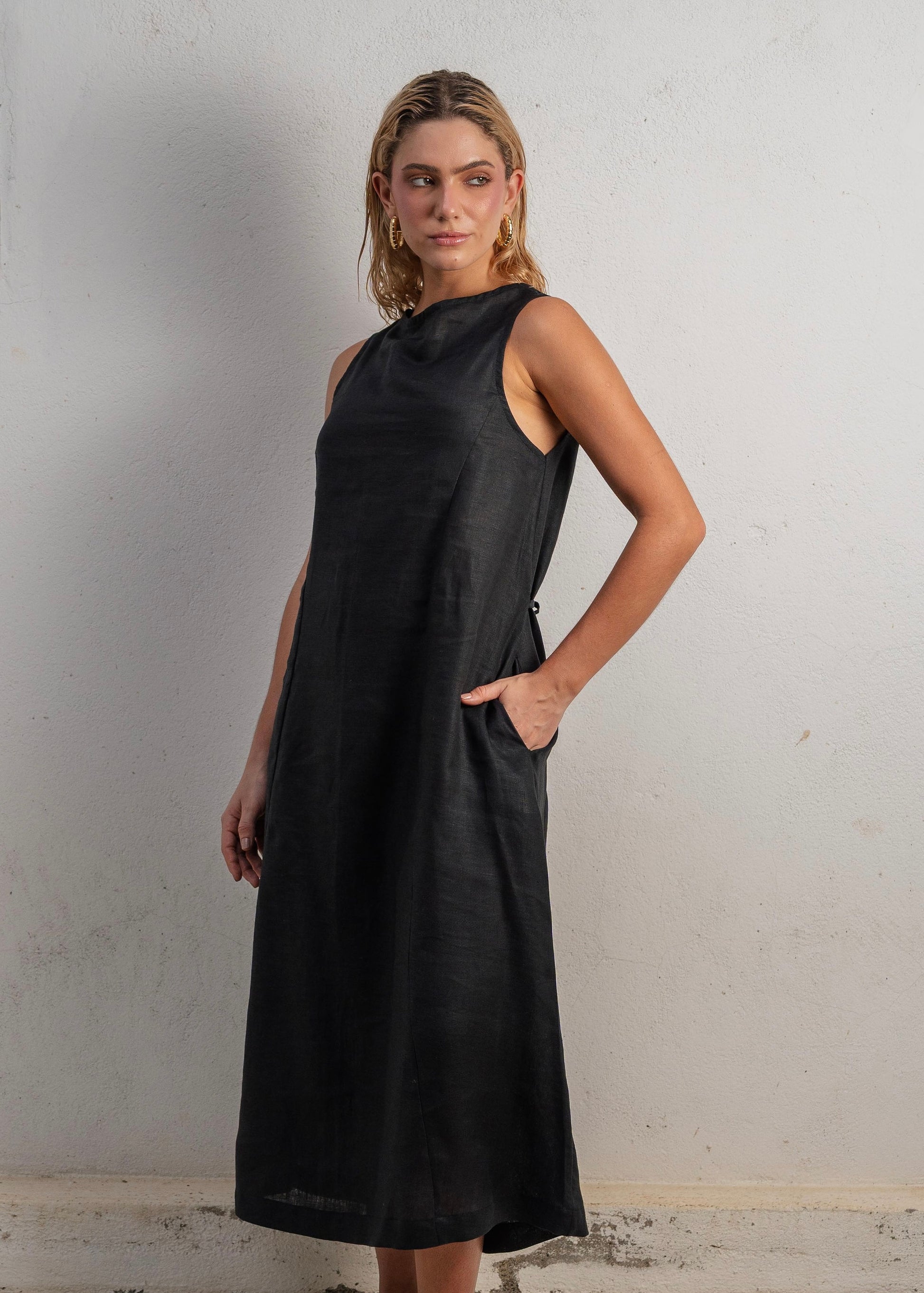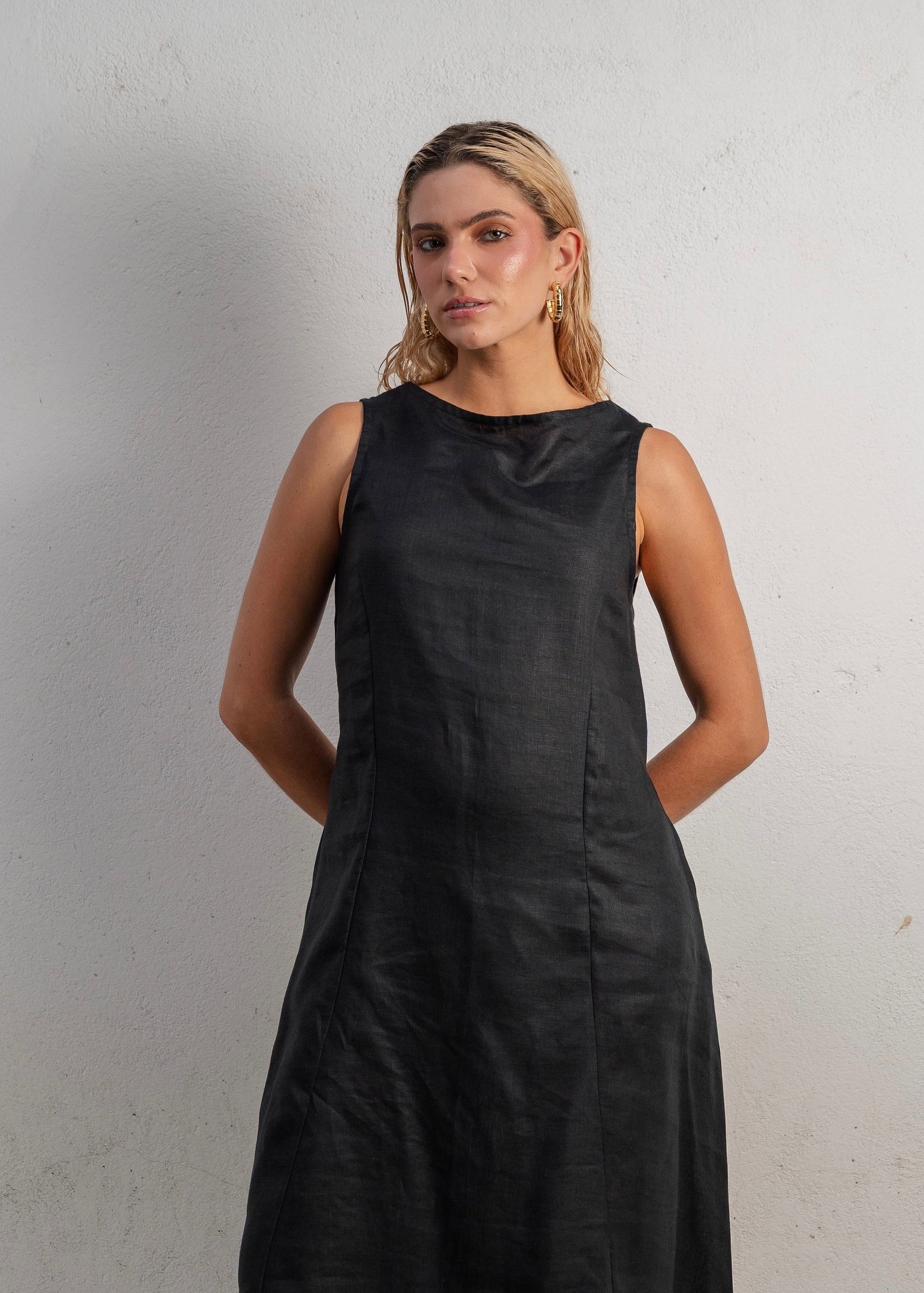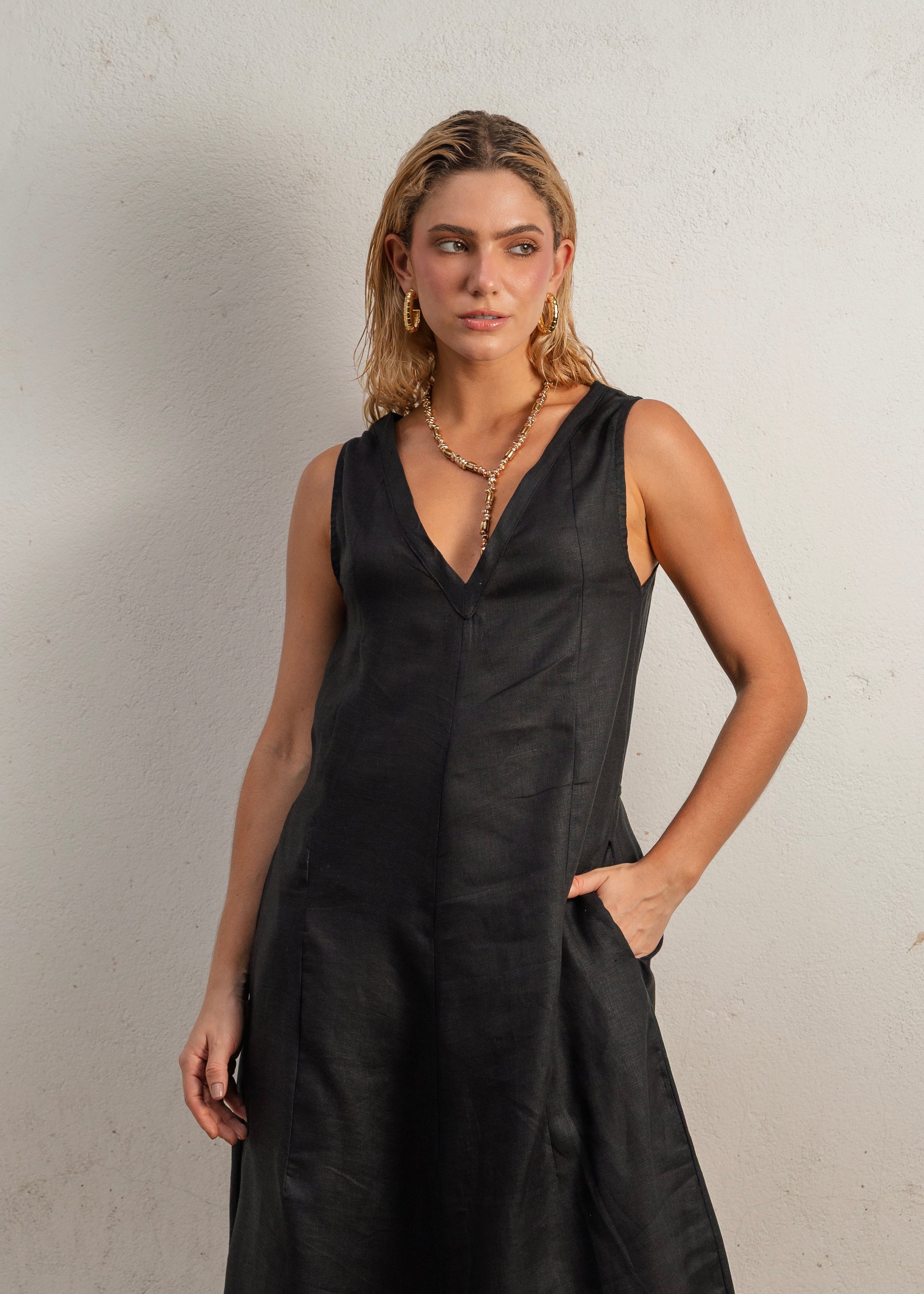 El Lush Dress Long en color Black es una declaración de elegancia minimalista. Confeccionado en lino 100% natural, este vestido largo combina estructura y fluidez en una silueta limpia, versátil y eternamente chic.
