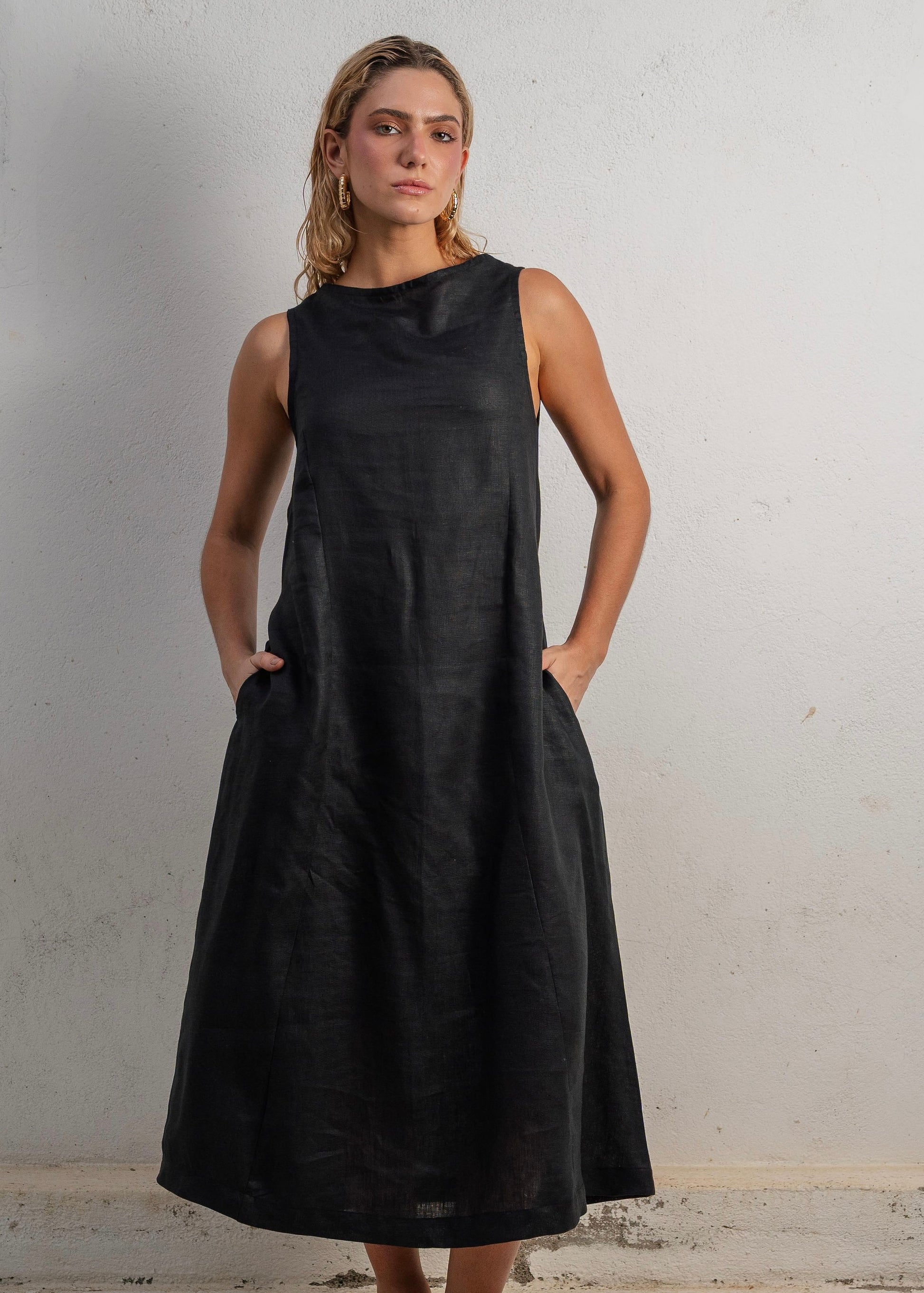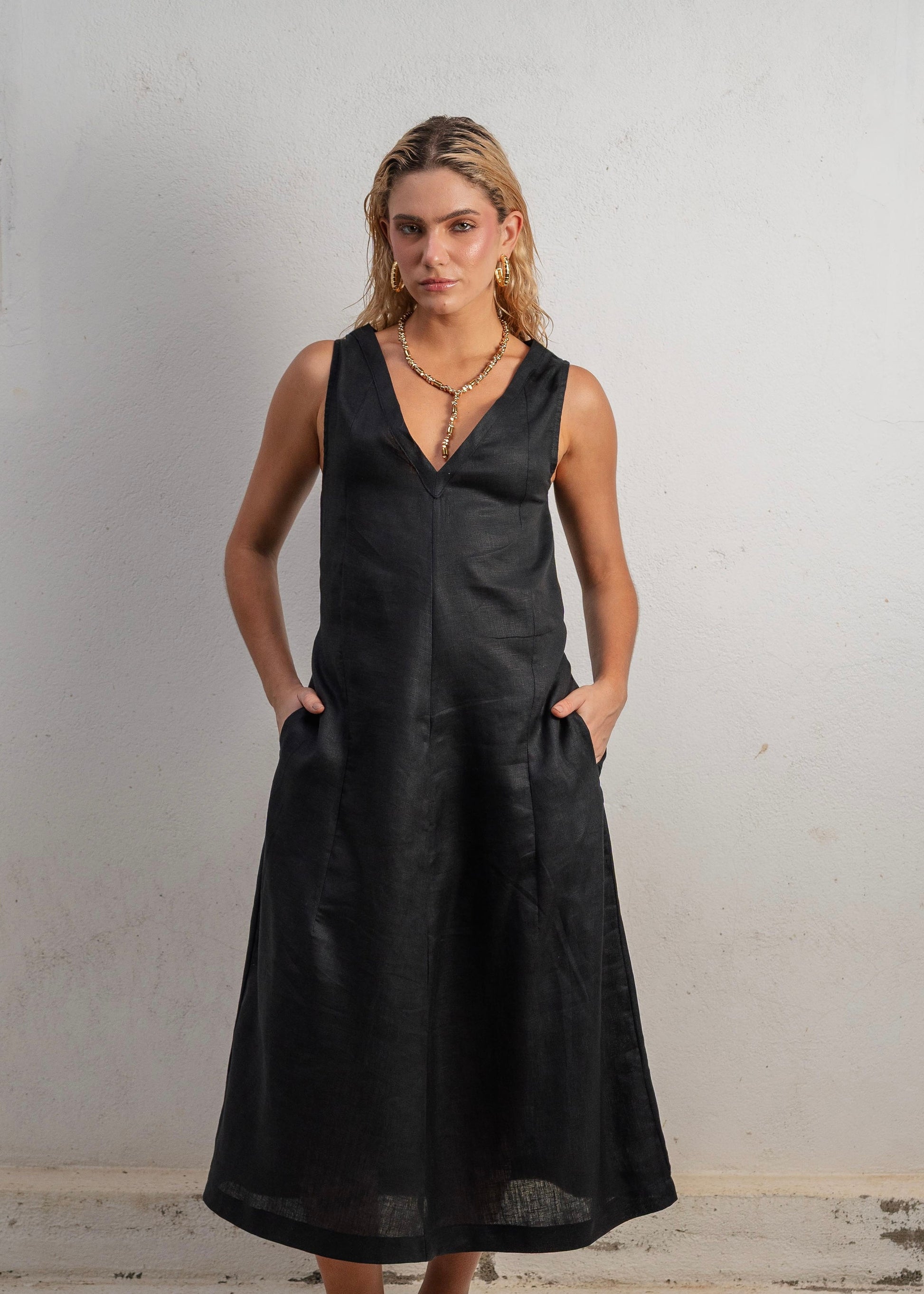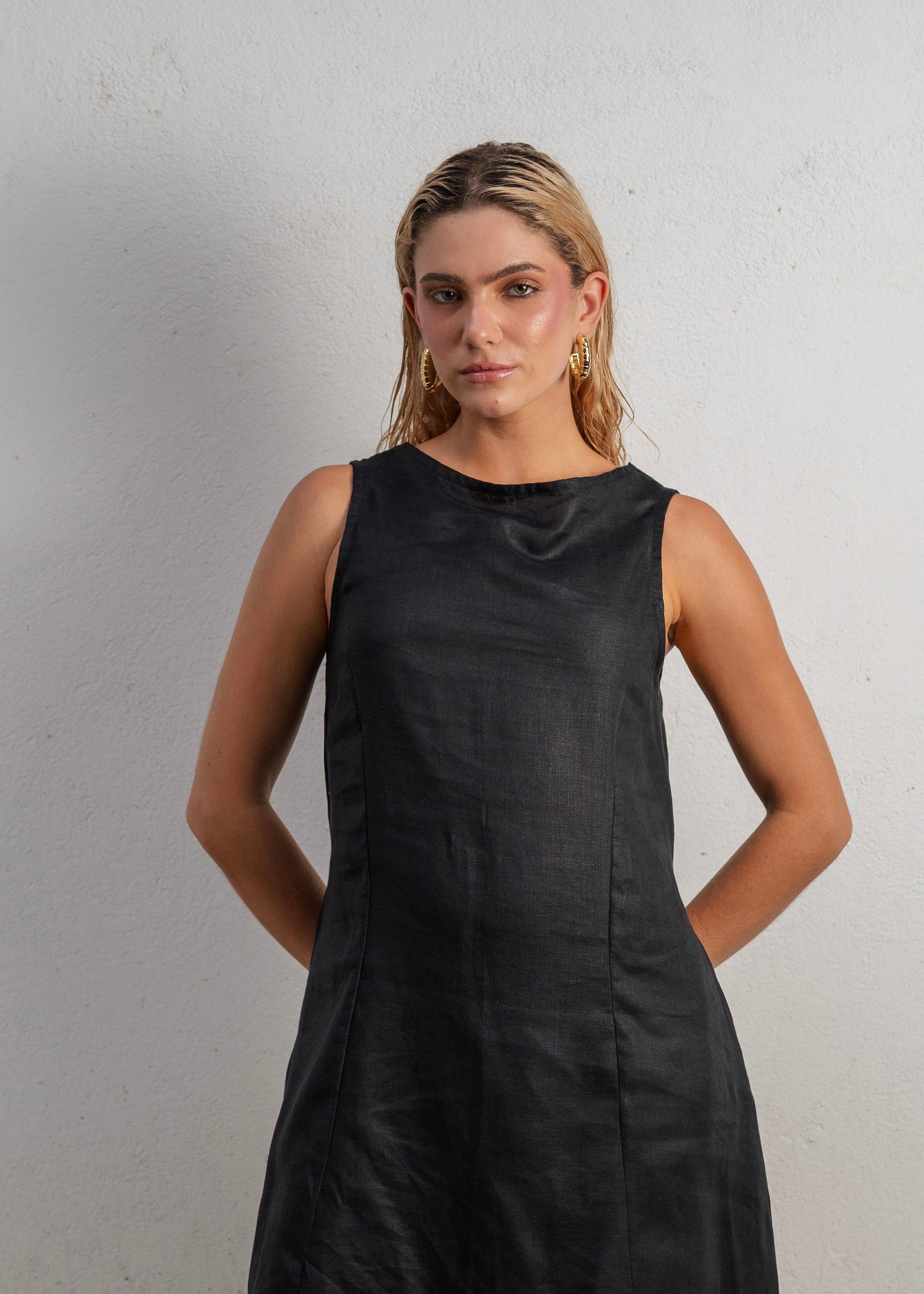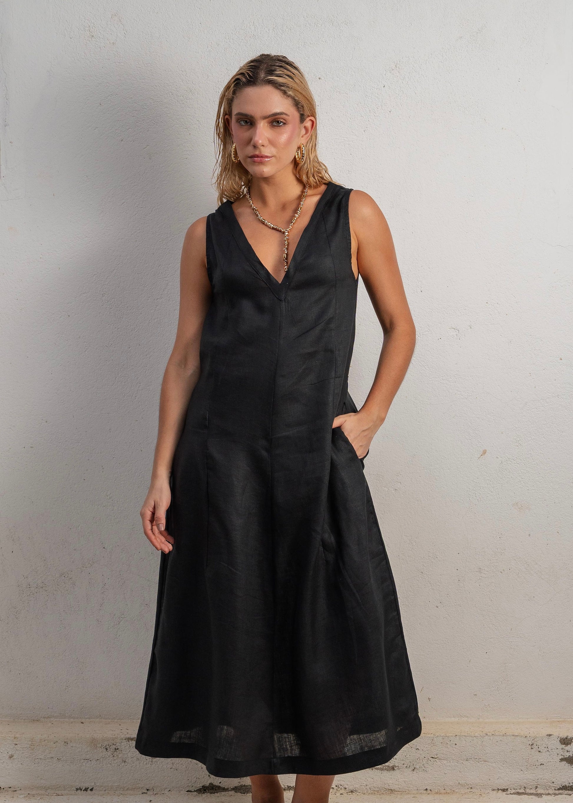 El Lush Dress Long en color Black es una declaración de elegancia minimalista. Confeccionado en lino 100% natural, este vestido largo combina estructura y fluidez en una silueta limpia, versátil y eternamente chic.