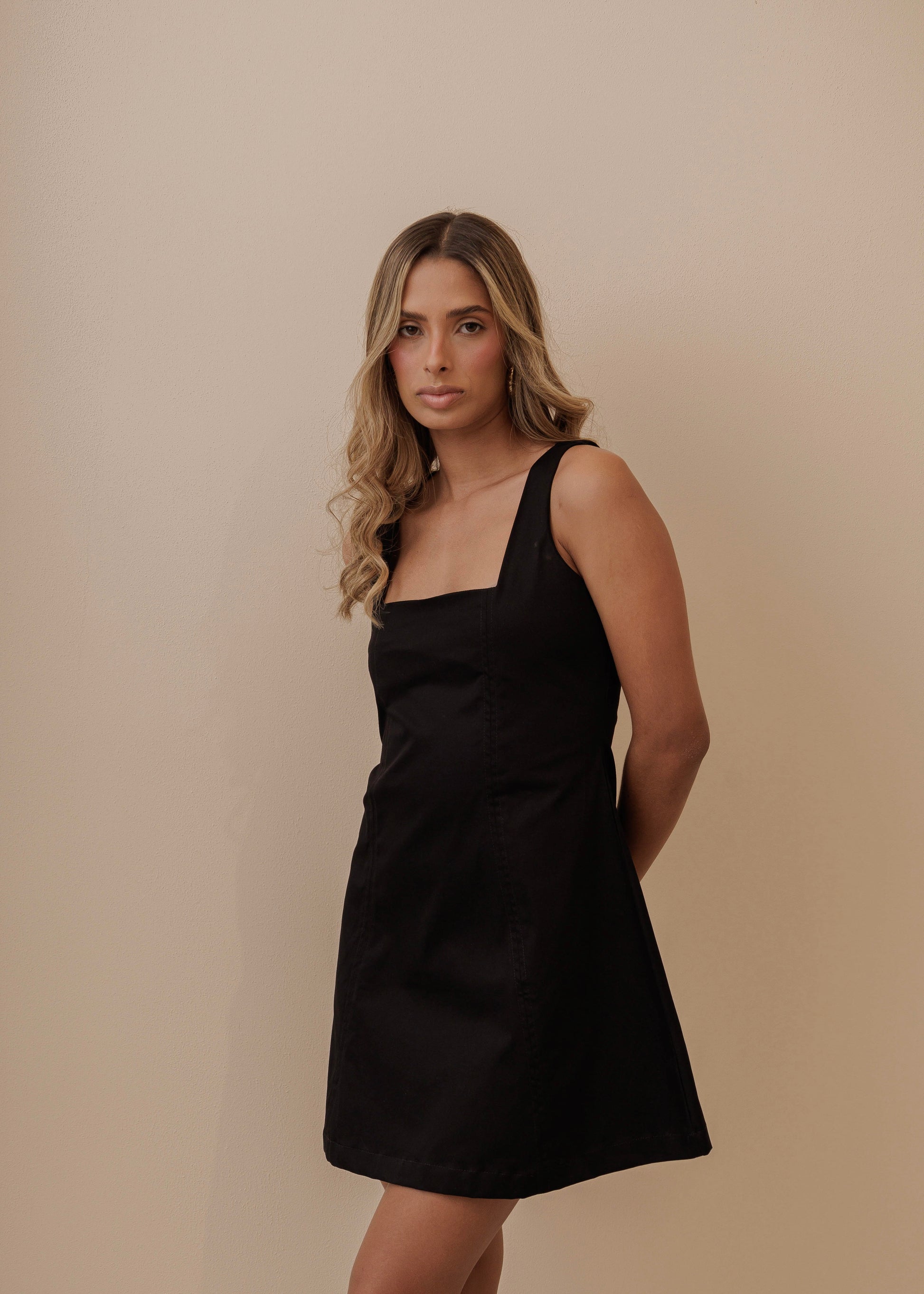 Diseñado con un corte ajustado que resalta la figura, el "MINI BLACK DRESS" combina elegancia y comodidad. El escote discreto y los detalles mínimos aseguran que el vestido se mantenga elegante y moderno. El tejido, de alta calidad y textura suave, proporciona un ajuste favorecedor y cómodo.