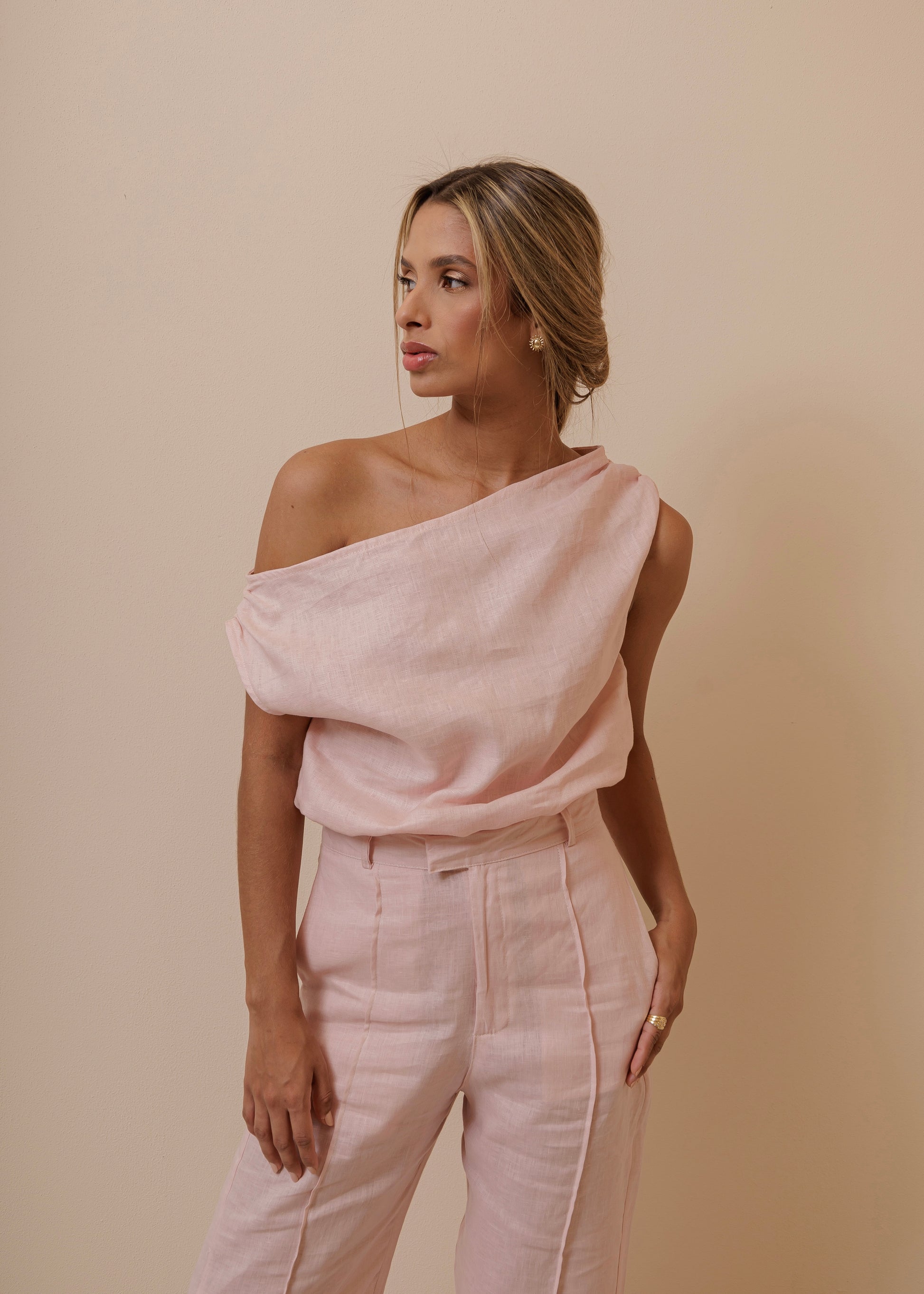 Con una caída fluida y sofisticada, este top es una pieza versátil que destaca por su estilo minimalista. Su diseño de un solo hombro crea una silueta elegante y moderna lo hace ideal para ocasiones especiales o para elevar cualquier look cotidiano.Esta pieza es perfecta para quienes buscan una prenda atemporal con un toque de delicadeza.