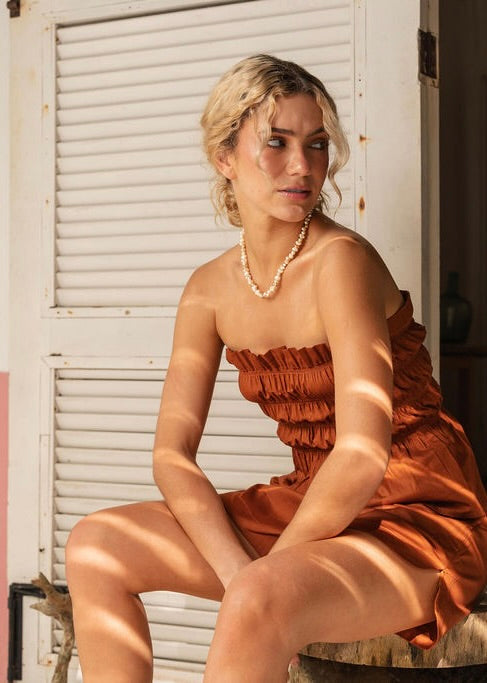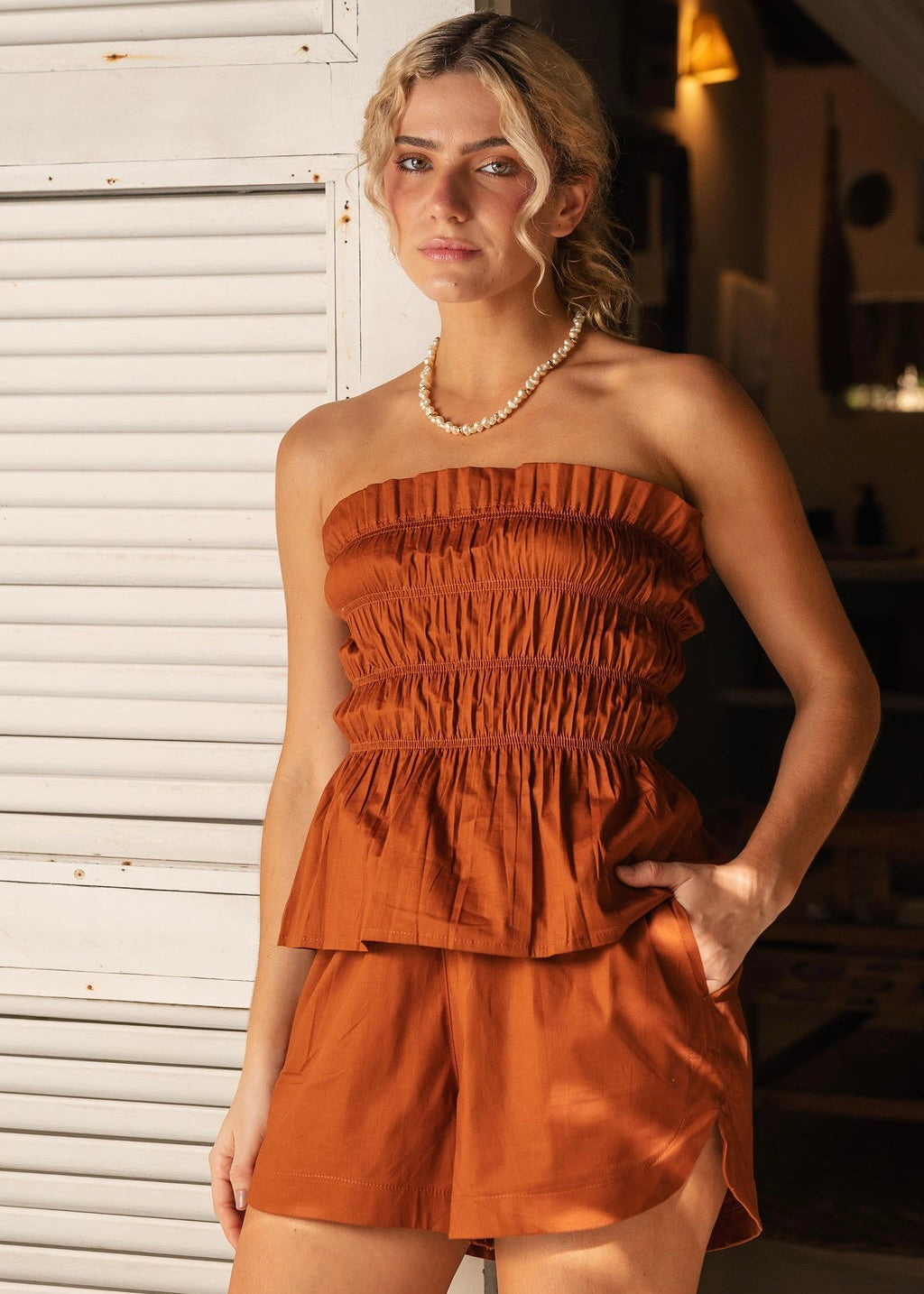 El top presenta detalles elásticos que realzan la figura sin sacrificar el confort, mientras que el short complementa el conjunto con un corte relajado y versátil. Su tono espresso —intenso y cálido— lo convierte en una opción ideal para cualquier temporada.