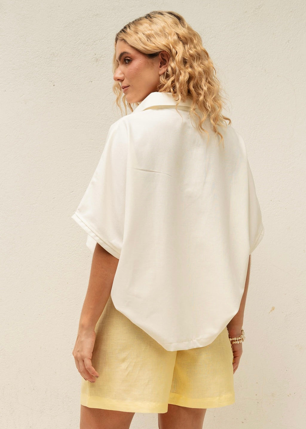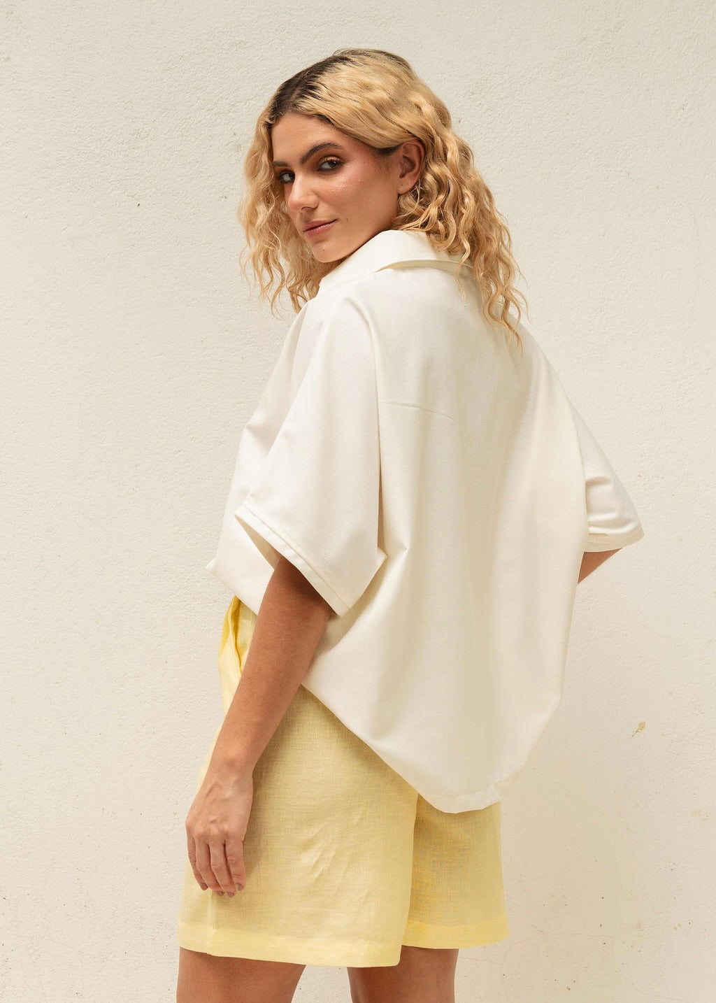 El tono Ivory, suave y luminoso, es perfecto para combinar con cualquier prenda, aportando un aire de pureza y sofisticación a tu look. Su corte cómodo y diseño minimalista hacen de esta camisa un básico imprescindible.